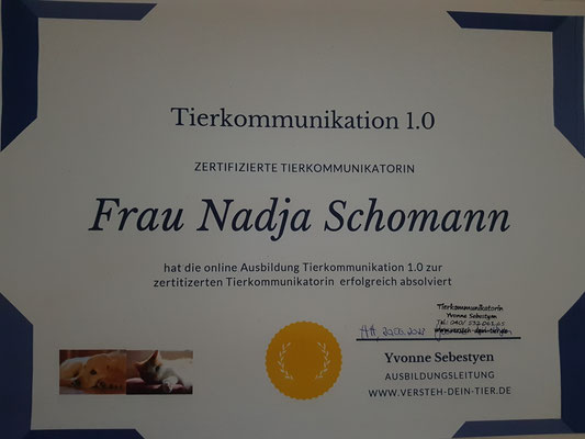 Um noch tiefer in das Verständnis der Tiere einzutauchen, absolvierte ich zusätzlich noch eine fast einjährige Ausbildung zur Tierkommunikatorin und Tierenergetikerin, die ich ebenfalls erfolgreich abgeschlossen habe.